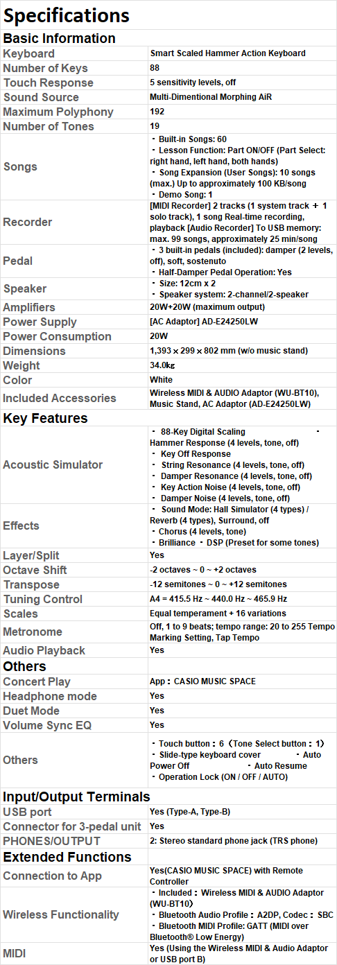 Casio is dedicated to the pursuit of grand piano tradition, and are meticulous about focussing on the essence of the piano—its sound and touch. Simultaneously, we have introduced various features that enhance the charm of the piano through new experiences. Powered by Casio's unique sound source technology, our instruments deliver delicate and rich tones. The acoustics system provides an unparalleled sense of authenticity, making you feel as if a grand piano is right in front of you. The integration of physical mechanisms and digital technology ensures responsiveness that is comparable to the sophisticated techniques of classical pianos, complementing the expression of the musical performance with a dedicated keyboard.